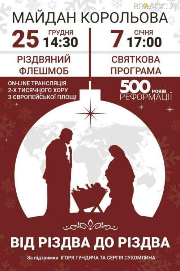 Житомир приєднався до Всеукраїнського флешмобу «Україна та світ святкують Різдво Христовe разом». Розпочнеться святкування на майдані ім. С. П. Корольова 25 грудня о 14:30 год. Про це повідомила прес-служба міської ради.