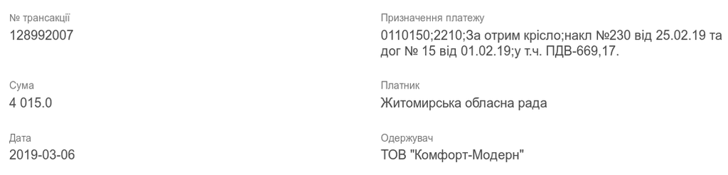 Житомирська обласна рада придбала крісло за 4 тис. 15 грн. Його купили у магазині, що знаходиться поряд із приміщенням облради. Кошти перерахували 6 березня.