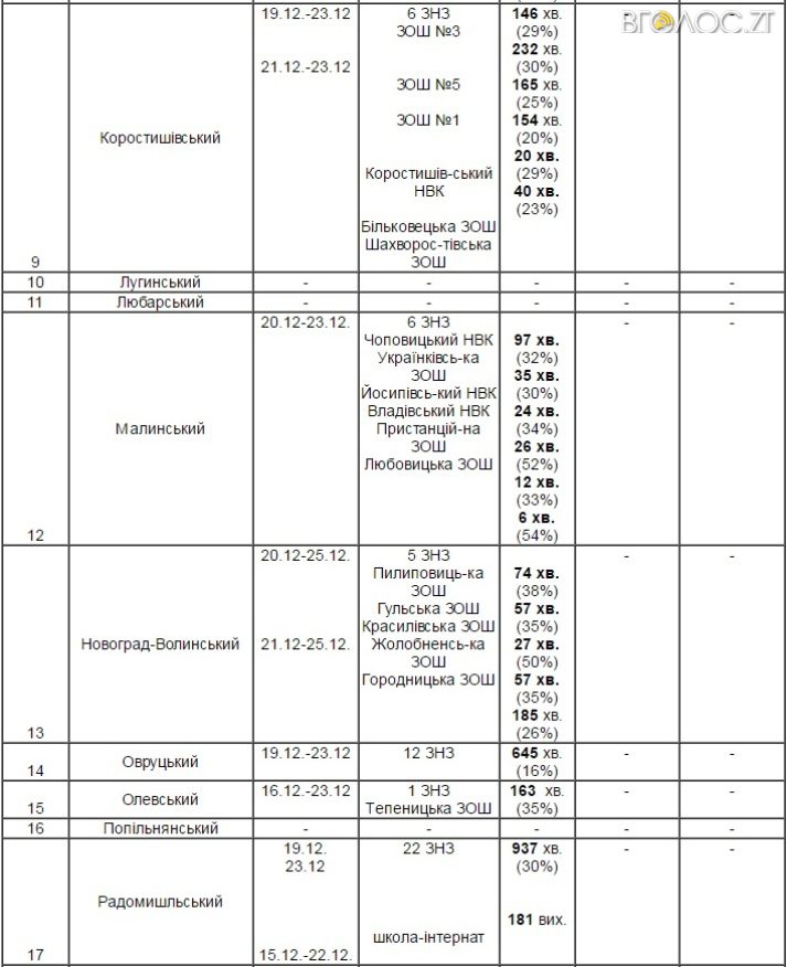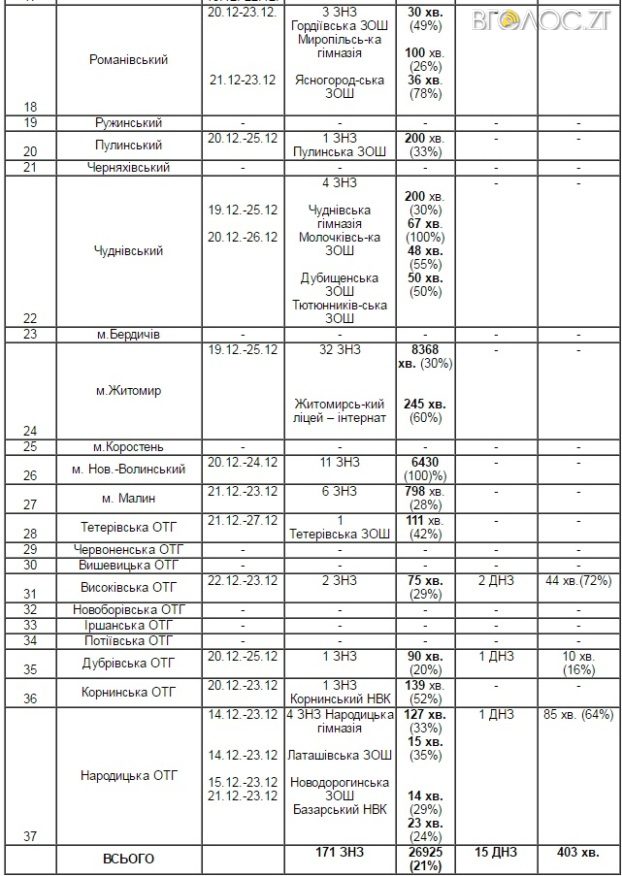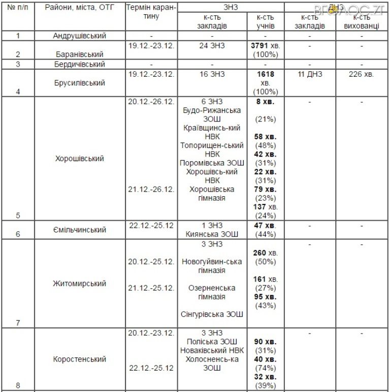 “Всі навчальні заклади продовжують функціонувати в Андрушівському, Бердичівському, Лугинському, Любарському, Попільнянському, Ружинському, Черняхівському районах, містах Бердичеві та Коростені, Червоненській, Вишевицькій, Новоборівській, Іршанській та Потіївській ОТГ”, – йдеться у повідомленні.