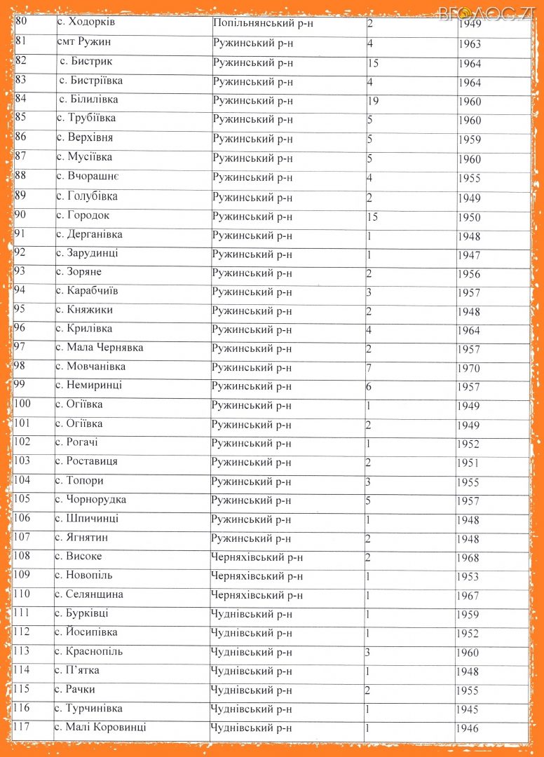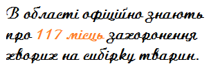 Але, водночас, на території Житомирської області нараховується 117 місць, де проводилися поховання сибіркових трупів тварин в різні роки. Останній випадок захоронення хворої на сибірку тварини офіційно був зареєстрований у 1970 році в селі Пединка Любарського району. Найбільше таких місць – у Ружинському та Попільнянському районах.
