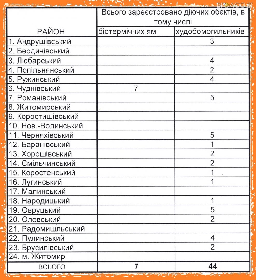 ої птиці. Кожен власник домашньої тварини в разі її смерті повинен негайно відправити все, що від неї залишилося, в це саме місце… Але у кількох районах області взагалі відсутні такі об’єкти. Зокрема, жодного худобомогильника немає у Житомирському, Бердичівському, Коростишівському, Малинському, Радомишльському та Новоград-Волинському районах.