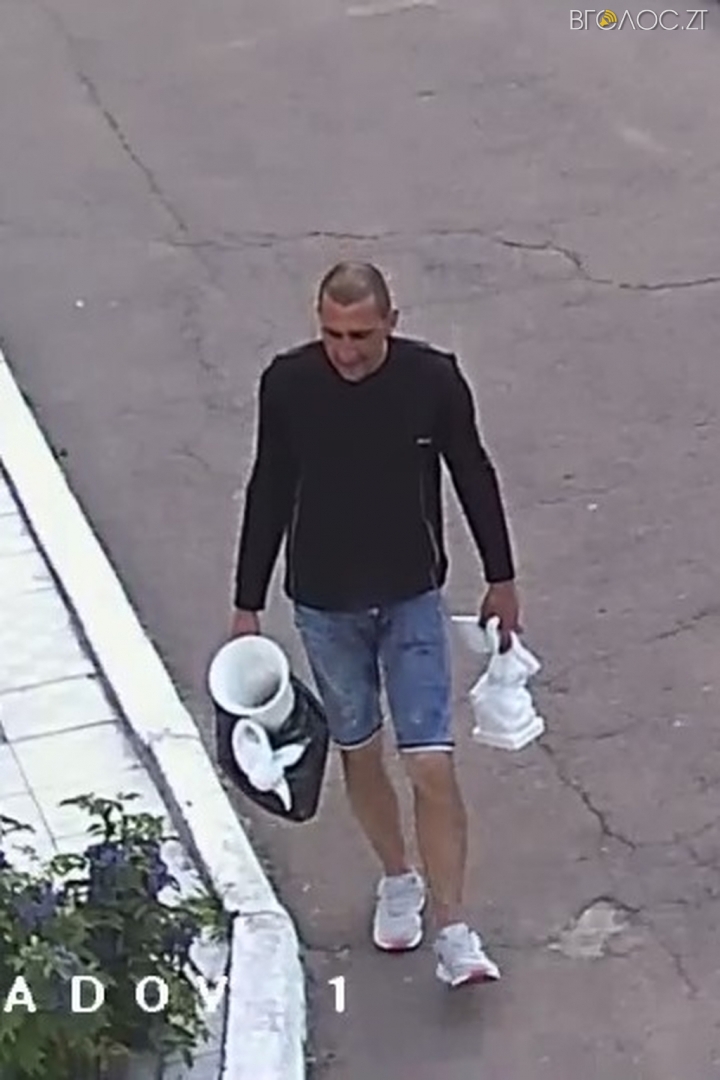 Молодик на фотографії несе мармурові скульптури у світлу пору доби. Правоохоронці просять всіх, хто бачив особу або знає її повідомити поліцію за телефоном 102.