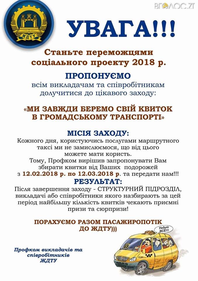 “Кожного дня, користуючись послугами маршрутного таксі, не замислюємося, що від цього ми можемо мати користь. Тому профком протягом місяця пропонує збирати від своїх подорожей квитки, які згодом можна буде обміняти на цінний подарунок. Викладачі та співробітники ЖДТУ, які назбирають протягом даного періоду найбільшу кількість квитків, будуть нагороджені призом від профкому”, – йдеться у повідомленні.