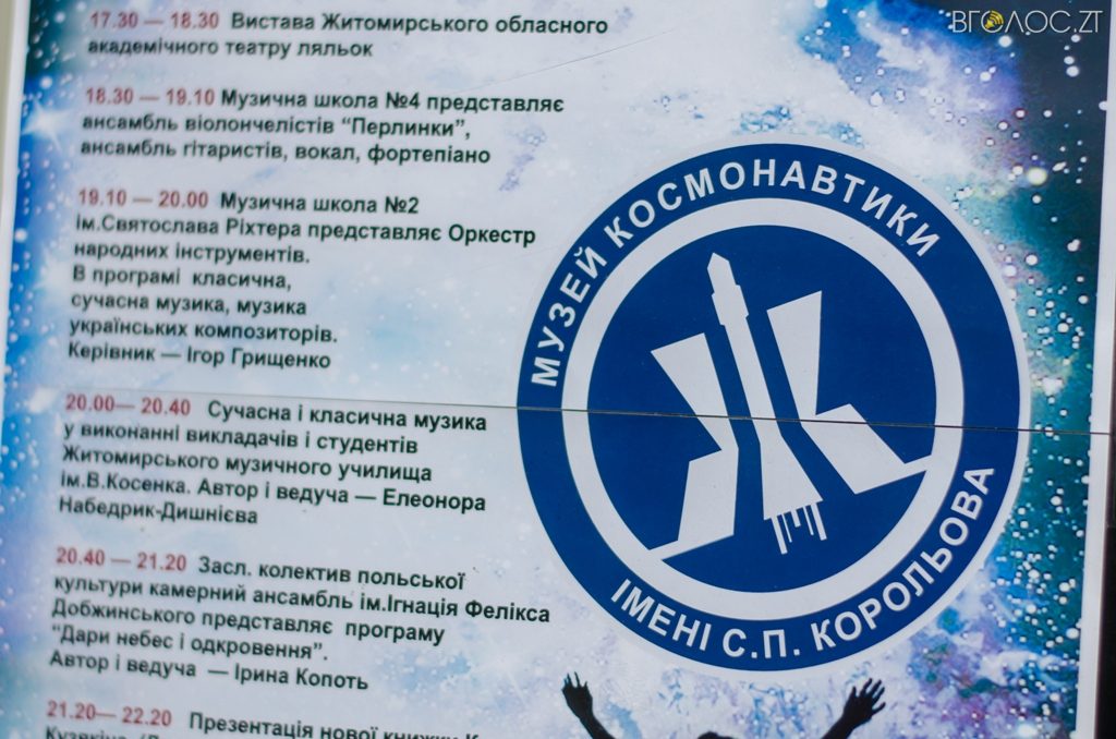 Щороку 18 травня – в Міжнародний День Музеїв європейські музеї влаштовують святкові заходи, відомі як «Ніч Музеїв». У Житомирі традиційно Музей космонавтики ім. С. П. Корольова долучився до святкування і 19 травня влаштовав мистецьку акцію “Ніч музеїв”.