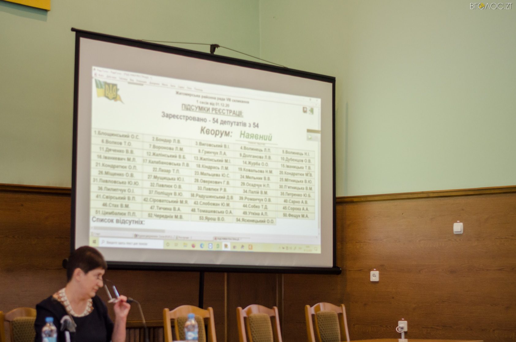 Перше пленарне засідання Житомирської районної ради VIII скликання відбулося 1 грудня 2020 року. Під час нього голова районної ТВК Валентина Колокольцева оголосила результати виборів та прізвища новообраних депутатів. Обранці склали присягу та приступили до виборів голови районної ради, його заступника та голів постійних депутатських комісій.