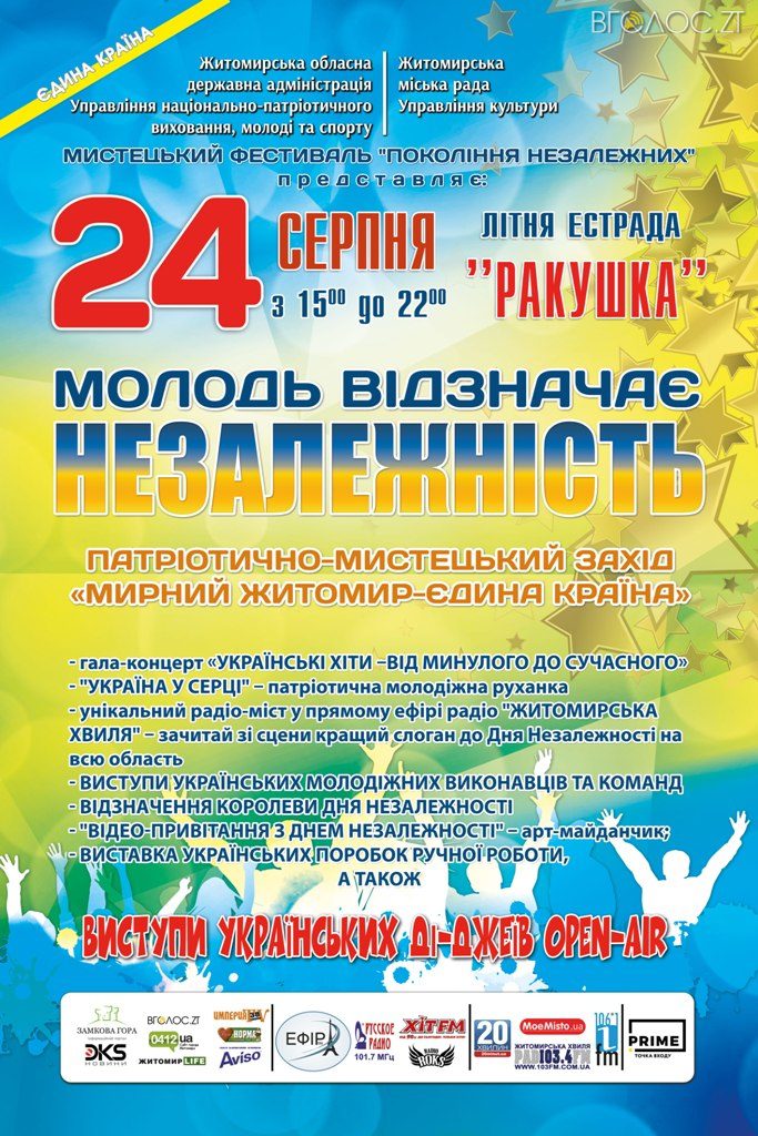Традиційно у День Незалежності України, 24 серпня, у літньому театрі “Ракушка” та прилеглій до нього території міського парку культури та відпочинку ім. Ю. Гагаріна краща творча молодь Житомирщини проведе щорічний фестиваль “МОЛОДЬ ВІДЗНАЧАЄ НЕЗАЛЕЖНІСТЬ–2018”. Серед організаторів – управління національно-патріотичного виховання, молоді та спорту Житомирської облдержадміністрації, управління культури Житомирської міськради, молодіжні організації, волонтери та громадські активісти.