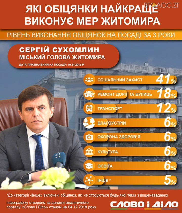 На посаді міського голови Житомира Сергій Сухомлин дав 53 обіцянки, включаючи передвиборчі. Виконав він 17 із них – більшість пов’язані із соціальним захистом населення, провалив – 9, у процесі залишаються ще 27. Про це повідомив аналітичний портал «Слово і Діло». Далі – кілька обіцянок, які були провалені і невиконані.