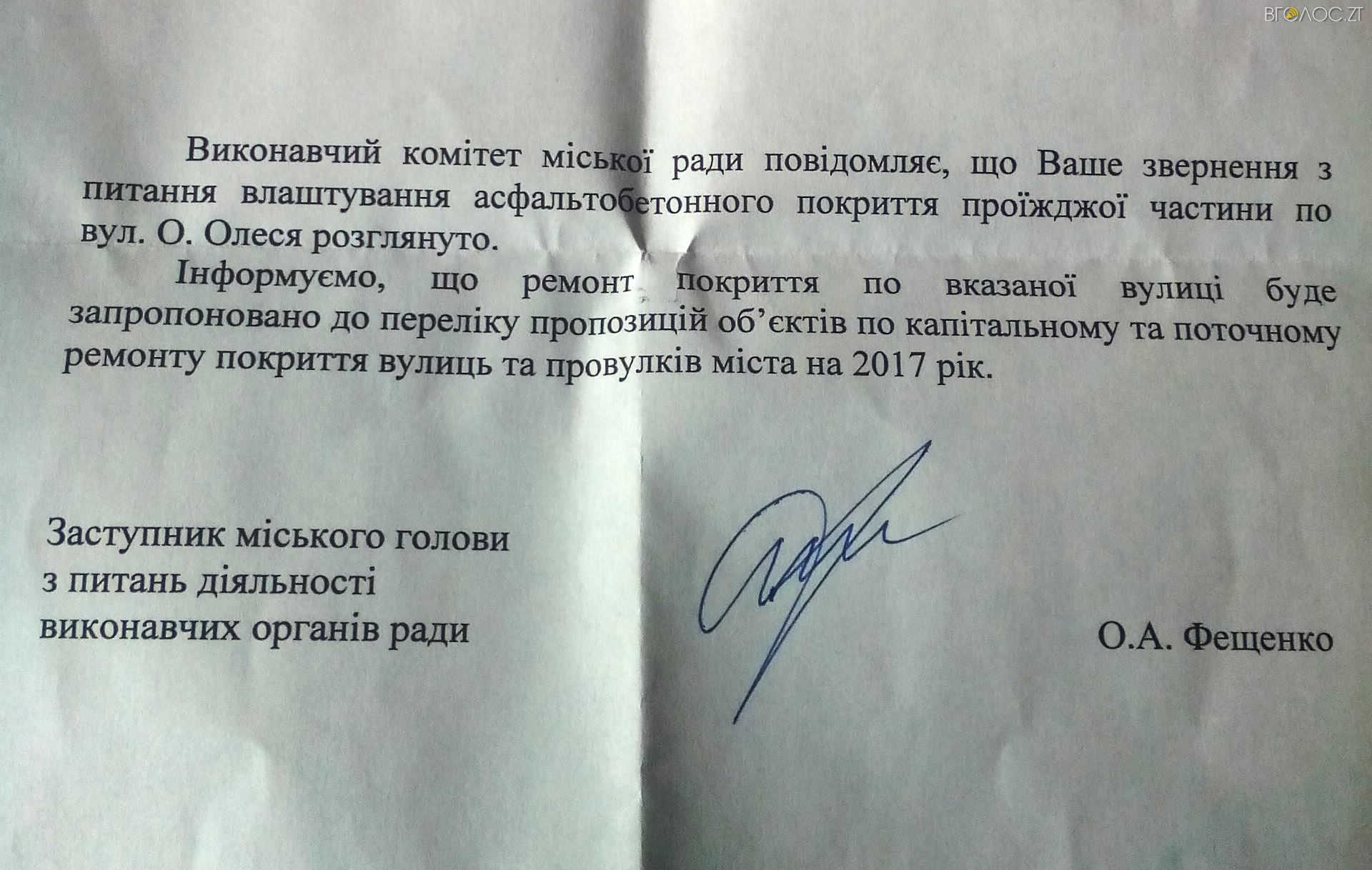 Жителі вулиці Олександра Олеся на прохання відремонтувати дорогу, по якій неможливо їздити, в черговий раз отримали “відписку” від міської влади. Про це “Вголос.zt” повідомив місцевий житель Олександр Максименко.