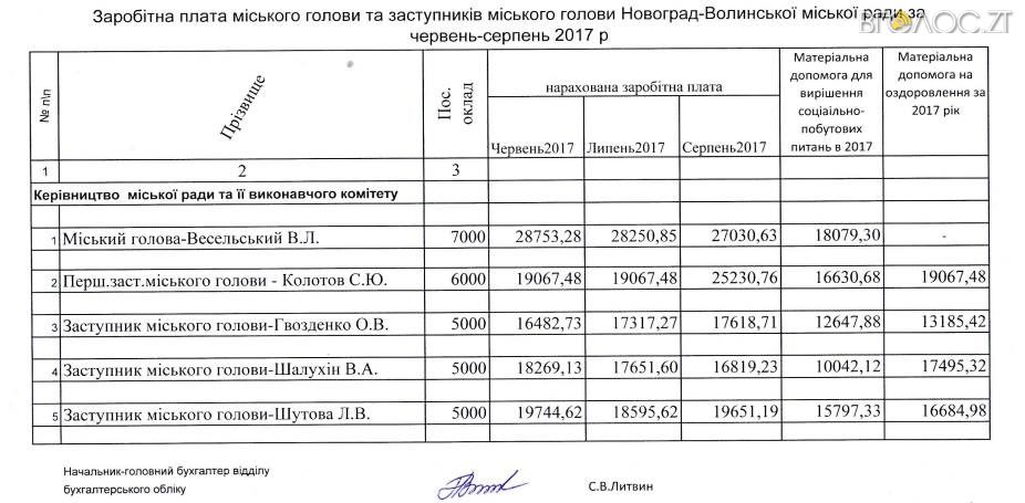 Зарплата інших трьох заступників у літні місяці становила від 16 тис. 482 грн до майже 20 тис. Усі троє цьогоріч отримували матеріальну допомогу. Зокрема, матеріальна допомога «для вирішення соціально-побутових питань» та на «оздоровлення» Оксани Гвозденко становила 25 тис. 833 грн 30 коп., Віктора Шалухіна – 27 тис. 537 грн 44 коп., Лариси Шутової – 32 тис. 482 грн 31 коп.