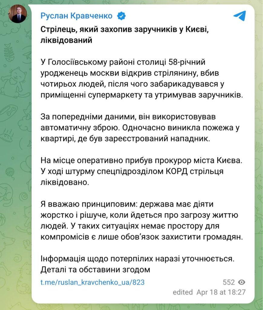 Зеленський: Щойно міністр внутрішніх справ України Ігор Клименко доповів про ліквідацію в Києві нападника, який відкрив вогонь по звичайних людях. Усі обставини зʼясовуються. Наразі відомо про 5 загиблих. Мої співчуття рідним та близьким.