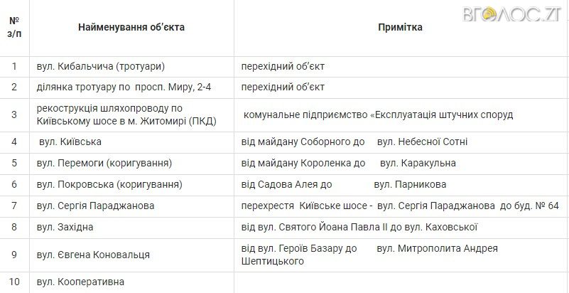 Виконавчий комітет Житомирської міської ради 18 квітня затвердив перелік вулиць та доріг, які відремонтують у 2018 році. Про це повідомила прес-служба міської ради. Відповідальним за проведення робіт визначили управління комунального господарства міської ради.