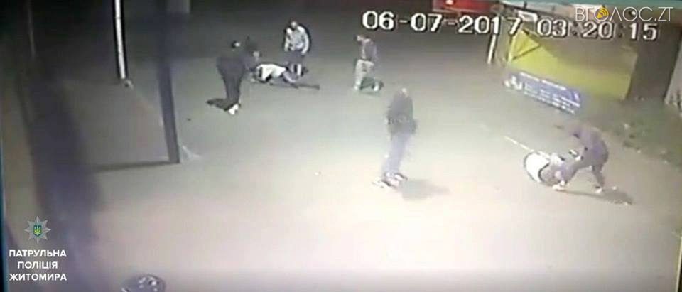 «Чоловіків, яких підозрюють у побитті двох перехожих, затримали патрульні на проспекті Миру 6 липня. Близько 3:00 інспекторам надійшло повідомлення про бійку. На місці події виявили двох чоловіків з тілесними ушкодженнями. Виявилось, що їх побила компанія невідомих, та ще й відібрали телефон. Патрульні переглянули запис камер відоспостереження магазину неподалік, дізнались прикмети нападників. Незабаром групу осіб, що підійшли за орієнтуванням, інспектори патрульної поліції затримали й доставили до Житомирського відділу поліції для з’ясування обставин справи слідчими. Постраждалим надали домедичну допомогу й викликали бригаду «швидко»ї. Чоловіків шпиталізували», – йдеться у повідомленні.