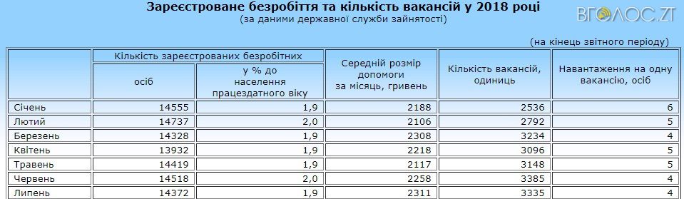 Відповідно до даних управління, на території області зареєстровано 14 тис. 372 безробітних, а вільних вакансій лише 3 тис. 335. У червні це число становило 14 тис. 518 осіб та 3 тис. 385 вакансій відповідно. Середній рівень грошової допомоги по безробіттю у липні зменшився на 53 грн і склав 2 тис. 311 грн.