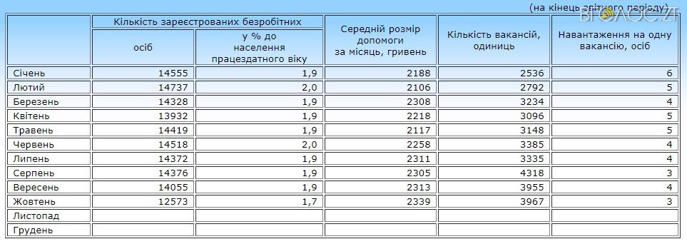 Відповідно до інформації статистів, загалом у жовтні центри зайнятості зареєстрували 12 тис. 573 безробітних. Це 1,7 % населення працездатного віку. Середній розмір допомоги по безробіттю становив 2 тис. 339 грн.