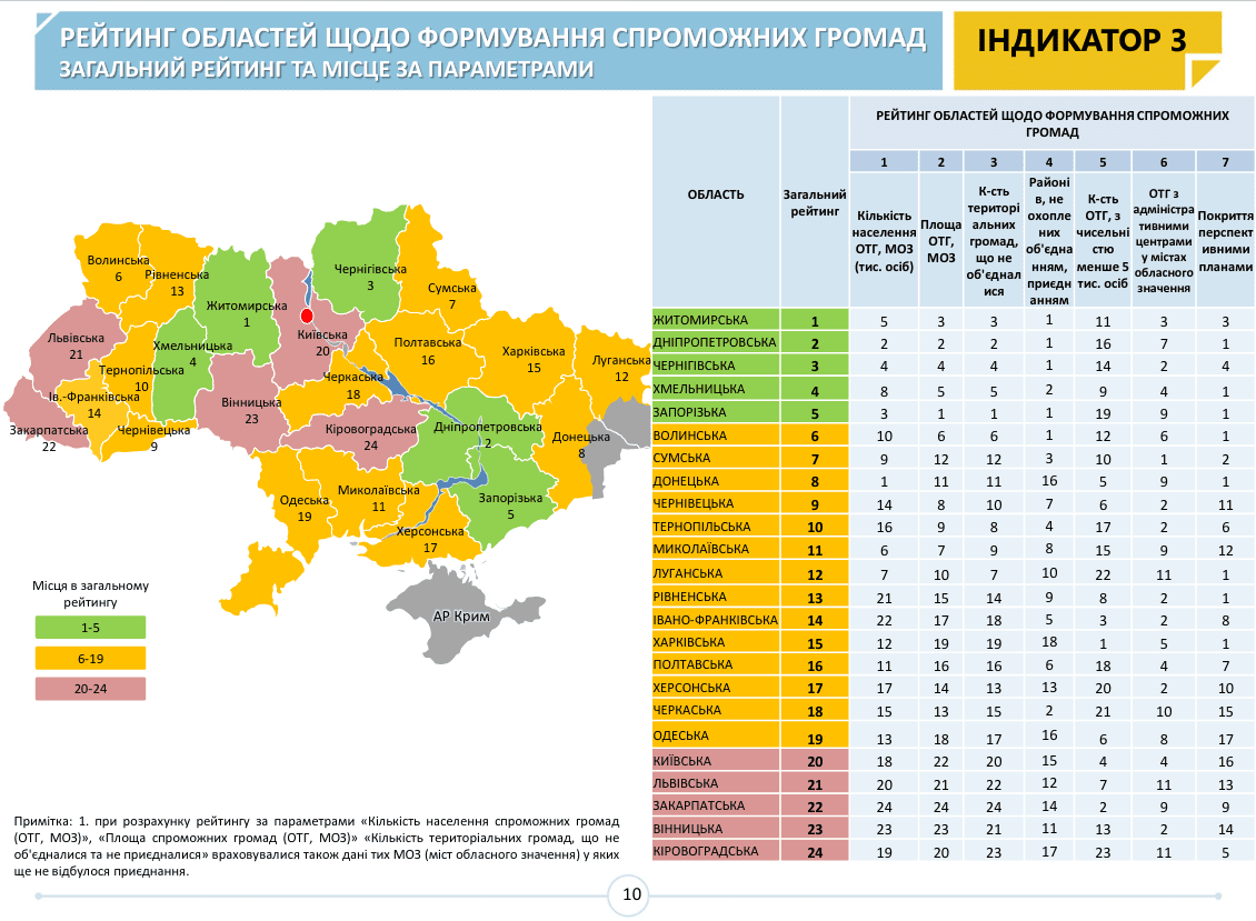 У всеукраїнському рейтингу за Житомирщиною йдуть Дніпропетровська та Чернігівська області. Київська та Вінницька області посідають, відповідно, 20-е та 23-е місця.