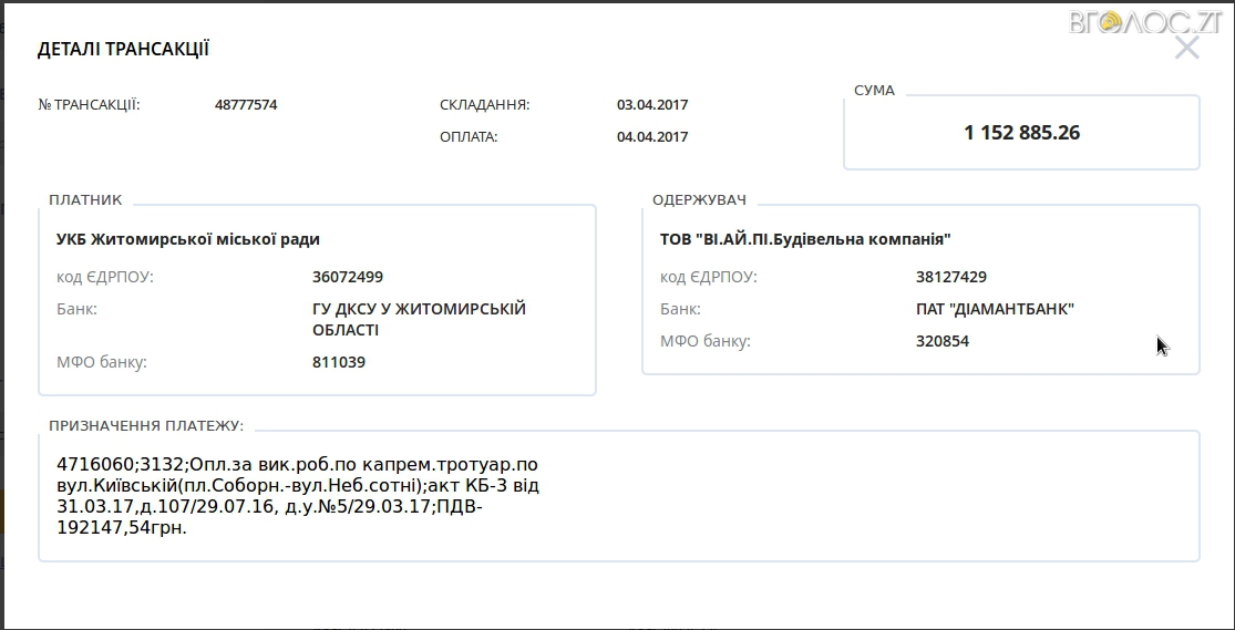 Примітно, що оплати здійснених львівським підрядником робіт було зроблено саме того дня, коли відбувалася сесія Житомирської міської ради.