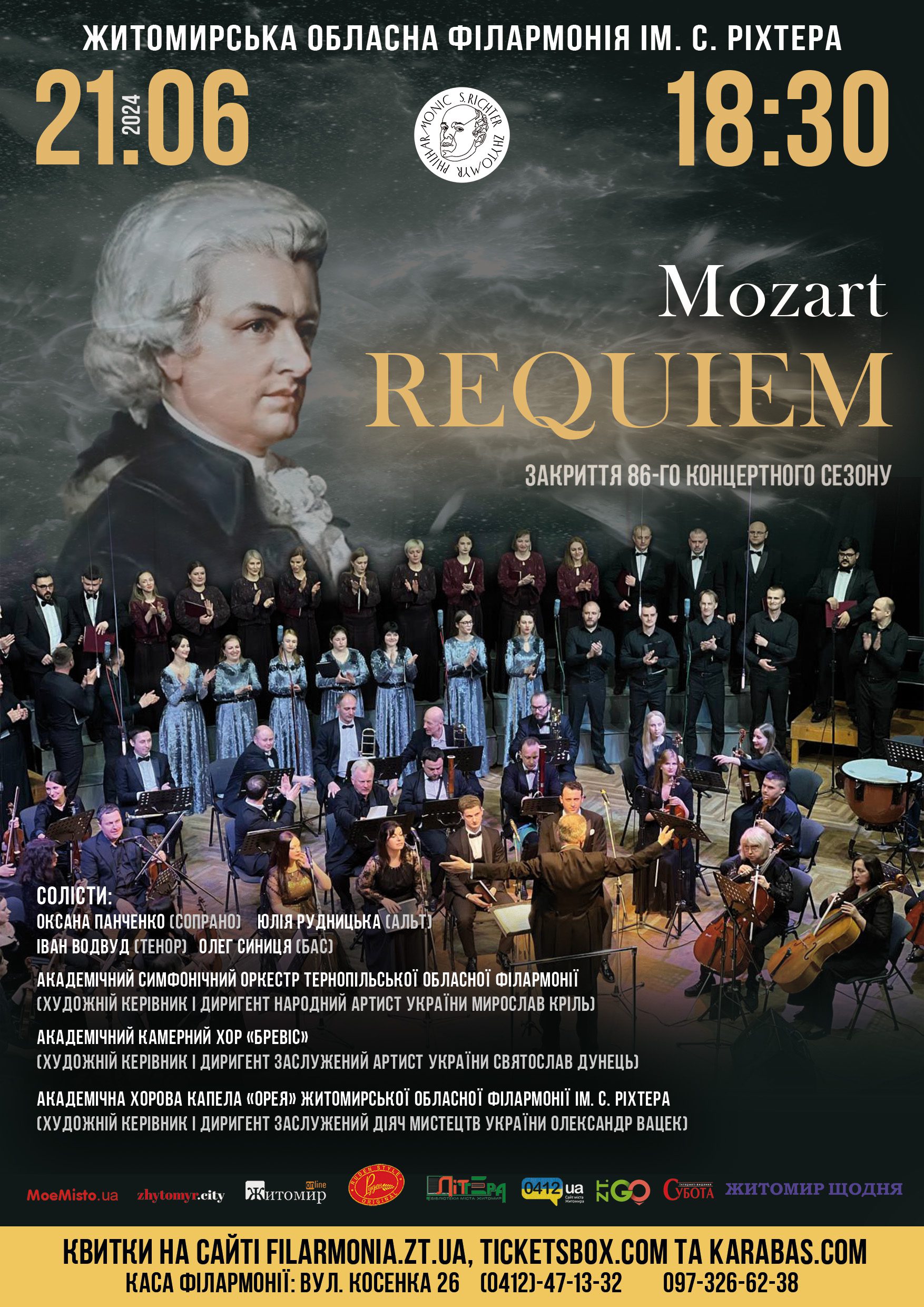 21 червня о 18:30 у рамках закриття 86-го концертного сезону на сцені Житомирської обласної філармонії ім. С. Ріхтера прозвучить шедевр, який належить до найвизначніших надбань музичної культури людства – «Реквієм» Вольфганга Амадея Моцарта!