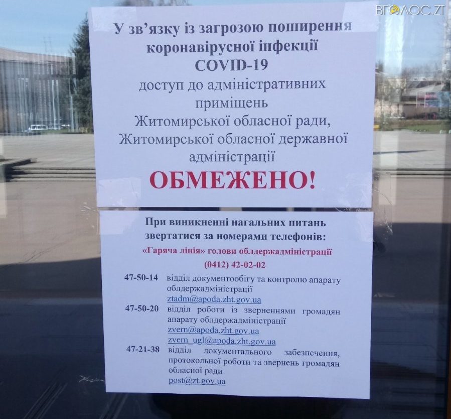 Житомирська обласна рада з 16 березня на період карантину працюватиме у дистанційному режимі. Відповідне повідомлення оприлюднили на сайті облради.