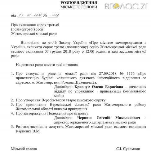 У Житомирі 7 грудня відбудеться позачергове засідання сесії міської ради. Відповідне розпорядження міський голова Сергій Сухомлин підписав 3 грудня.