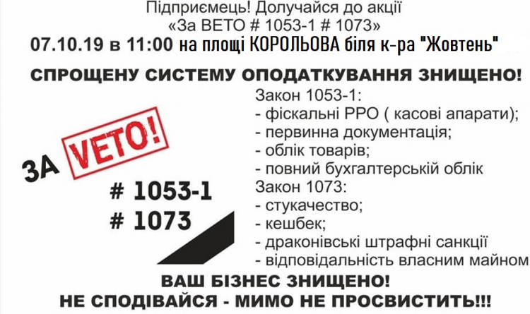 Підприємці Житомирщини закликають своїх колег вийти на акцію протесту проти законів №№ 1053-1 та 1073. Вона відбудеться 7 жовтня об 11:00 біля кінотеатру «Жовтень». Про це на своїй сторінці у мережі Facebook написав голова Всеукраїнського комітету «Громадська спілка захисту та розвитку бізнесу «Відсіч» Сергій Зайцев.