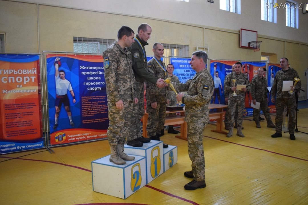“Серед учасників чемпіонату — 3 заслужених майстра спорту України, 1 майстер спорту України міжнародного класу, 10 майстрів спорту України та 12 кандидатів у майстри спорту України. Загалом, у чемпіонаті брали участь близько ста спортсменів-гирьовиків, які представляли збірні команди всіх військових “вишів”. У загальнокомандному заліку І місце виборола збірна команда Житомирського військового інституту імені С. П. Корольова, ІІ місце здобула команда Харківського Національного університету Повітряних Сил імені Івана Кожедуба, ІІІ місце посіла Національна академія Сухопутних військ імені гетьмана Петра Сагайдачного”, – йдеться у повідомленні.