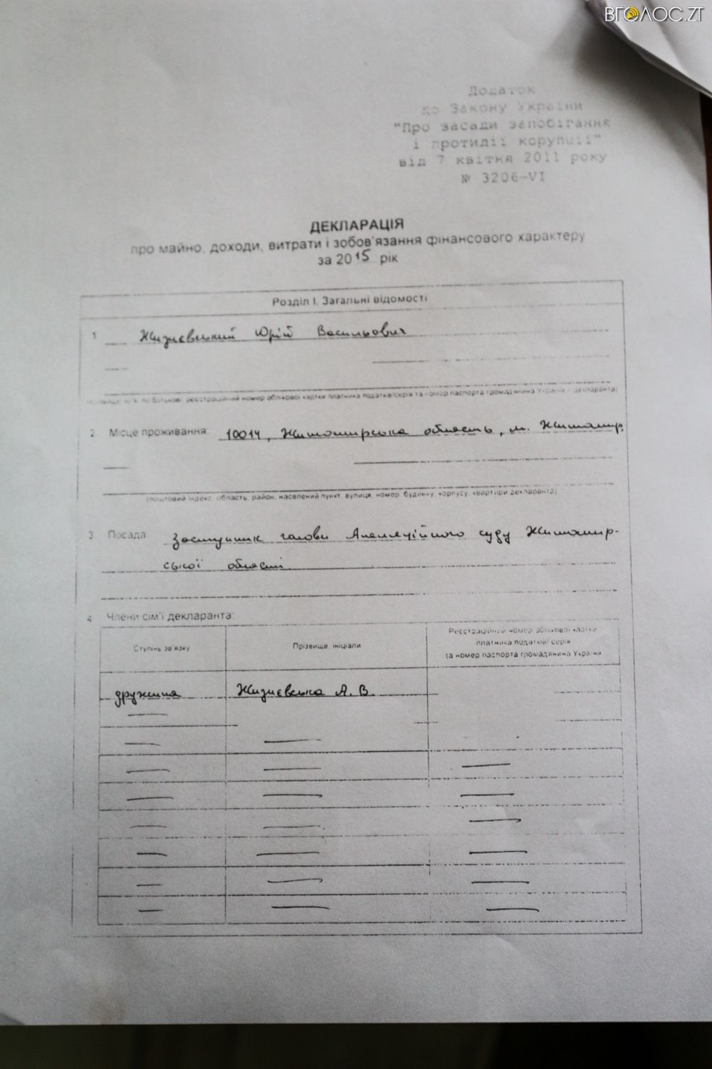 Сімейний дохід за 2015 рік заступника голови Апеляційного суду Житомирської області Юрія Жизневського – 1 мільйон 190 тисяч 648 гривень. У цьому він “перевершив” керівника Апеляційного суду Віталія Котіка.