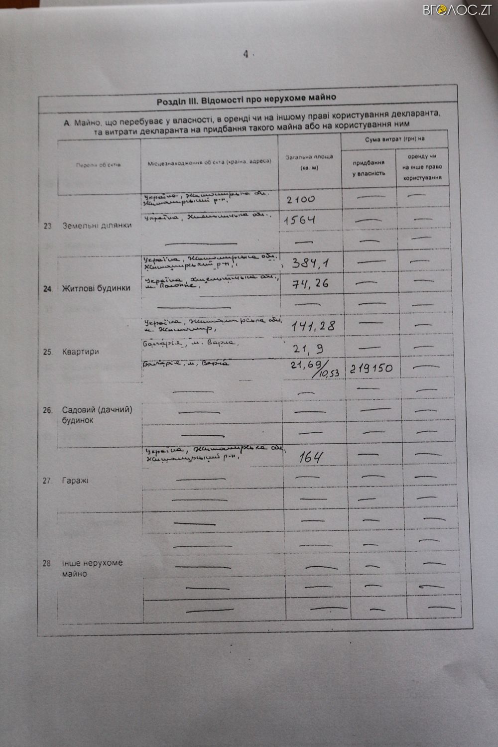Суддя володіє двома земельними ділянками у Житомирській та Хмельницькій областях, має будинок у селищі Гуйві площею 384,1 кв.м та у Хмельницькій області площею 74,26 кв.м. У Житомирі Жизневський має квартиру площею 141,28 кв.м. Є у судді нерухомість у Болгарії. Квартиру у місті Варна він придбав торік, ще одну купив там у 2013 році. У заступника голови суду гараж у Житомирському районі площею 164 кв.м.