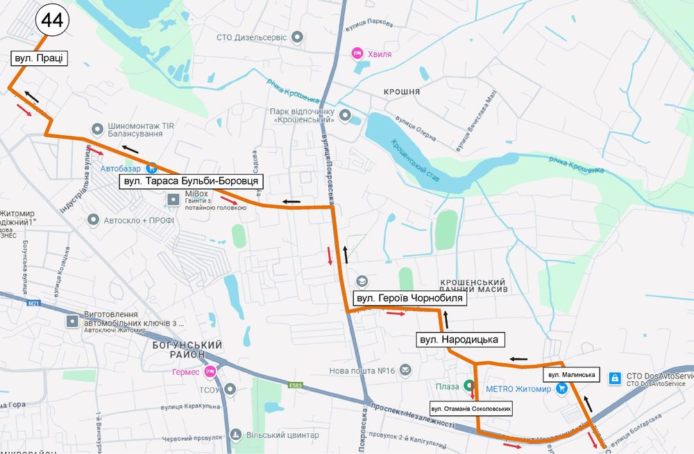З метою транспортного забезпечення вулиць Праці, Тараса Бульби-Боровця з іншими районами міста Житомира, з 18.12.2024 міський автобусний маршрут № 44 буде продовжений з ринку «Малинський» до вул. Праці згідно наступної схеми: міське кладовище ‒ шосе Західне – вул. Чуднівська – майдан Соборний – вул. Велика Бердичівська – вул. Селецька – вул. Вітрука – вул. Шевченка – вул. Івана Сльоти – вул. Бориса Тена – вул. Східна – вул. Малинська – вул. Народицька (вул. Отаманів Соколовських – просп. Незалежності) – вул. Героїв Чорнобиля – вул. Покровська – Тараса Бульби-Боровця – вул. Бялика – вул. Праці.