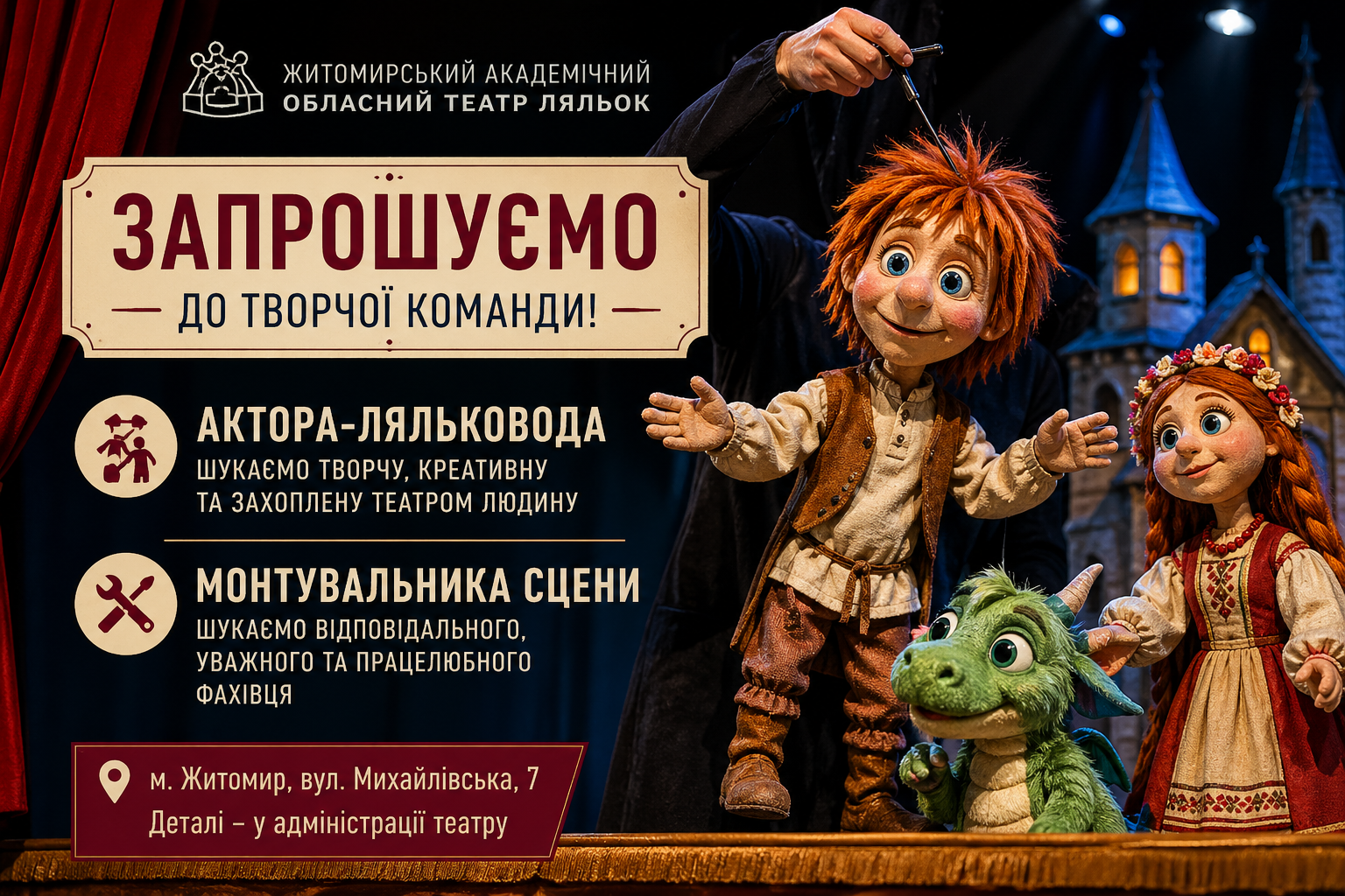 Житомирський академічний обласний театр ляльок оголосив набір до творчої команди та запрошує охочих долучитися до роботи в одному з провідних культурних закладів регіону.