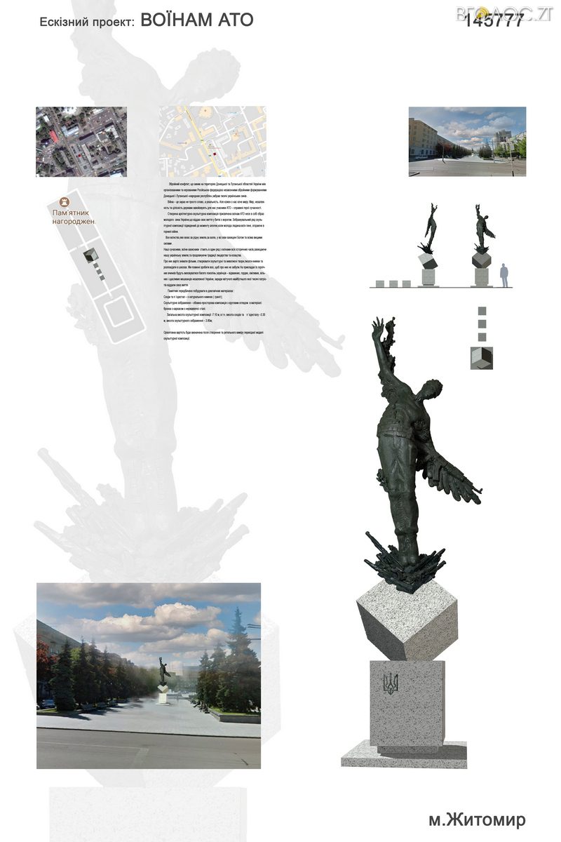 Міська рада запрошує громадськість взяти участь в оцінюванні конкурсних пропозицій на кращий пам’ятний знак/композицію “Воїнам Житомирщини – захисникам Вітчизни, загиблим у збройному конфлікті на Сході України”, який планують розмістити у сквері по вулиці Перемоги, 2. Про це повідомила пресслужба міської ради. Під час першого етапу конкурсу журі вже обрало п’ять кращих пропозицій для оприлюднення та онлайн-опитування.
