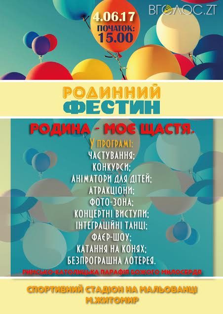 Римо-Католицька Парафія Божого Милосердя запрошує житомирян на Родинний фестин. Благодійна святкова забава відбудеться на спортивному стадіоні, що на Мальованці. Про це «Вголос.zt» повідомили організатори заходу.