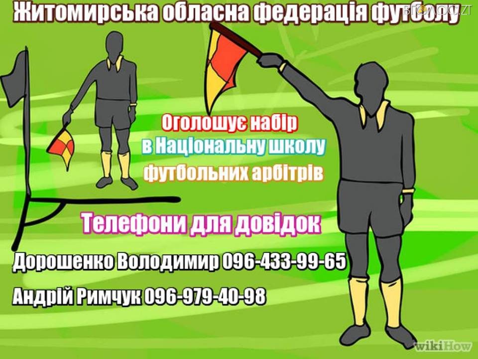 Регіональні школи футбольних арбітрів діють на території всієї України. У Житомирі набір проводиться вже вчетверте. Розпочати навчання у школі можуть всі бажаючі, як чоловіки так і жінки, віком від 15 років. Лише необхідно мати довідку від лікаря про допуск до занять фізичною культурою. Система навчання включатиме в себе теоретичний курс та заняття з фізичної підготовки. Набір проводитиметься до кінця січня 2017 року.