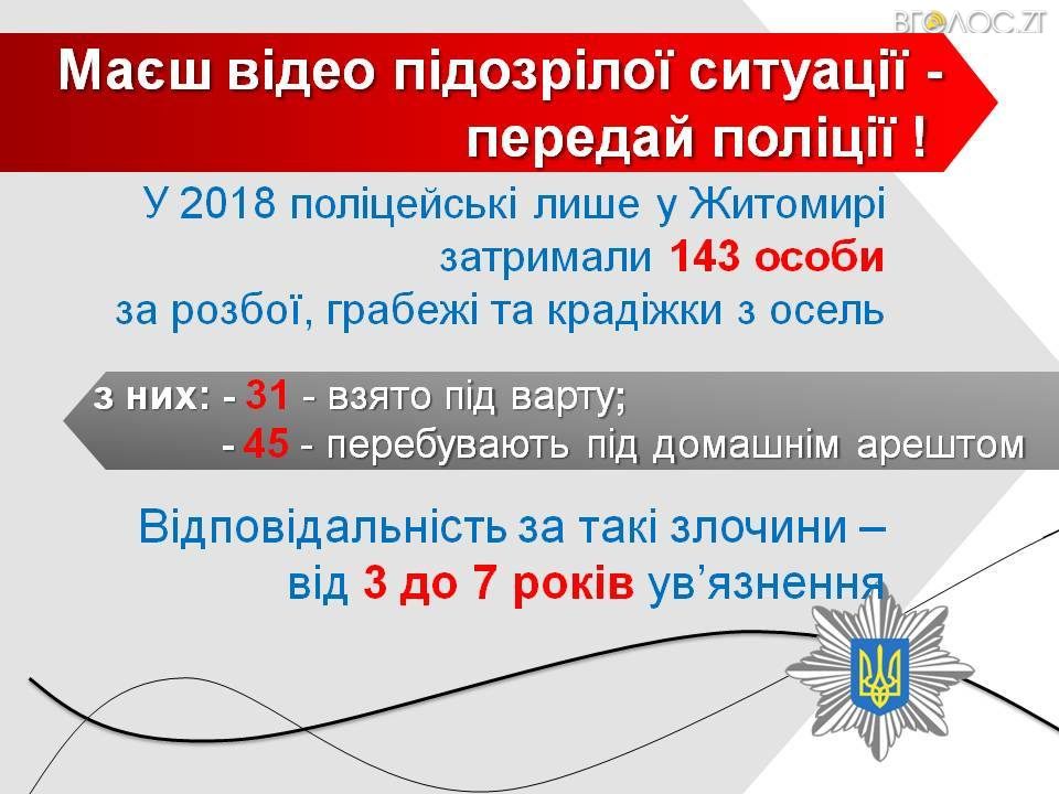 “У зв’язку із необхідністю ідентифікації осіб, причетних до крадіжок, грабежів та розбоїв, поліція Житомира відкрила канали WhatsApp та Viber, за якими можна надсилати відео, зняте камерами візуального спостереження біля будинків або у під’їздах. У разі якщо під час перегляду відеозаписів ви помітили незрозумілі ситуації або підозрілих осіб (смикають ручки дверей, розглядають замки, вікна чи балкони і т.д.), надішліть ваш запис за номером 068 158 24 88. Конфіденційність гарантується. Ваша інформація може допомогти у встановленні осіб злочинців”, – йдеться у повідомленні.