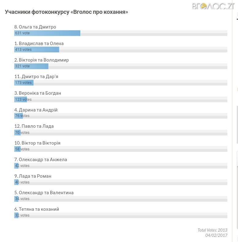 Редакція «Вголос.zt» оголошує завершення інтернет-голосування за переможців у фотоконкурсі до Дня Святого Валентина – «Вголос про кохання». У голосуванні взяли участь понад 2000 житомирян. За підсумками голосування переможцями конкурсу стали учасники, які змагалися під №8 – Ольга та Дмитро Макаруки. Саме ця закохана пара отримає сертифікат на вечерю для двох у паб «Кочерга»! Вітаємо переможців! Дякуємо усім учасниками за активну участь у конкурсі!