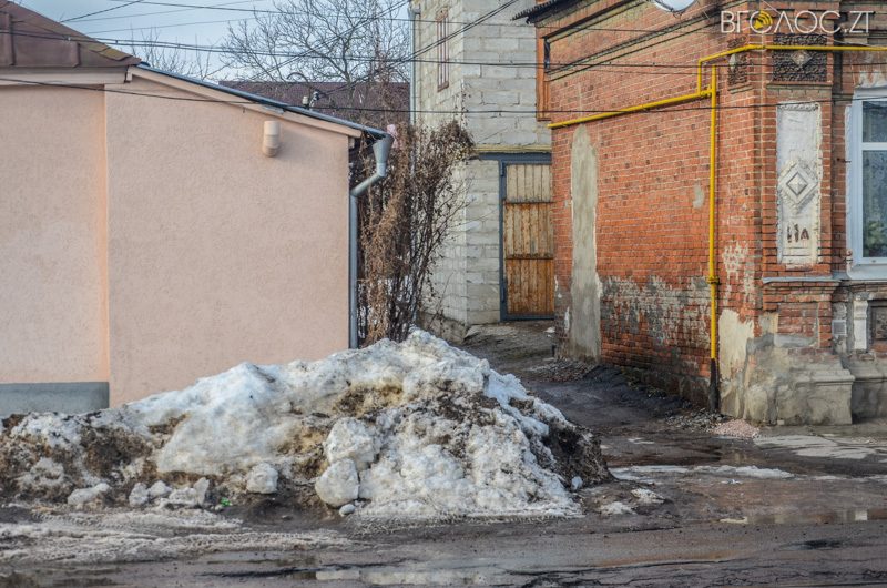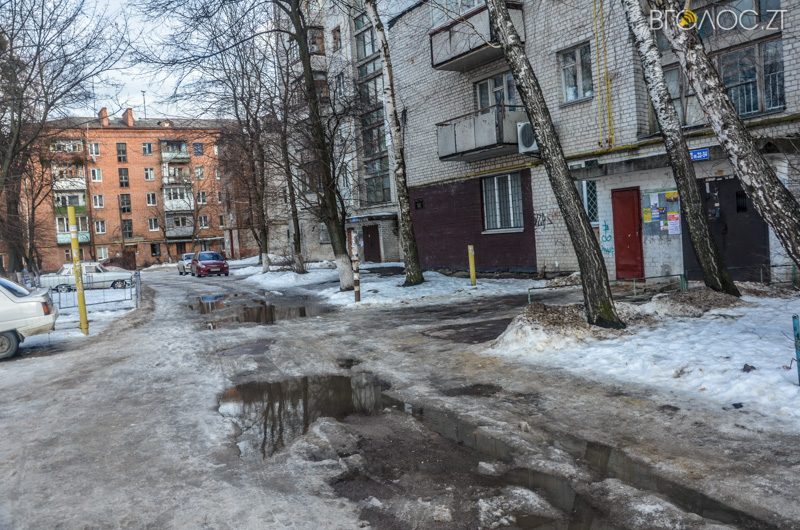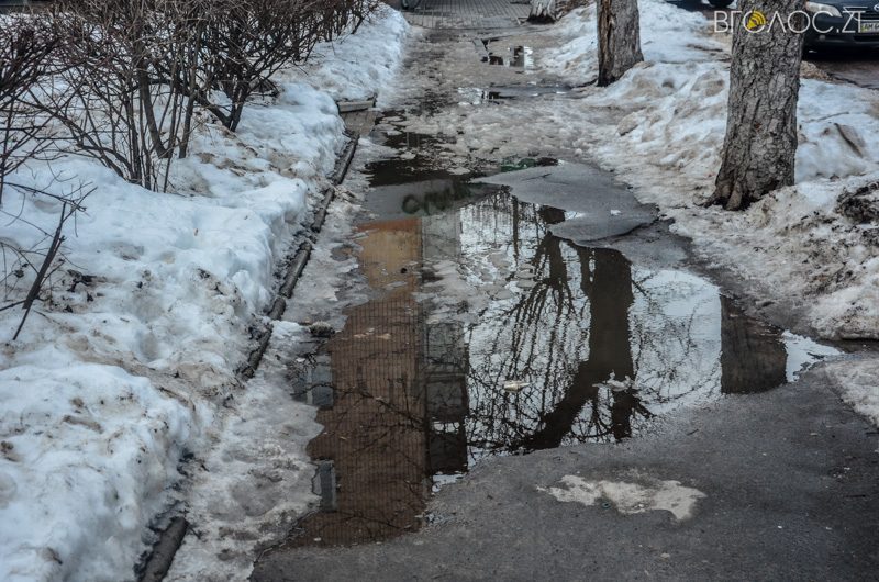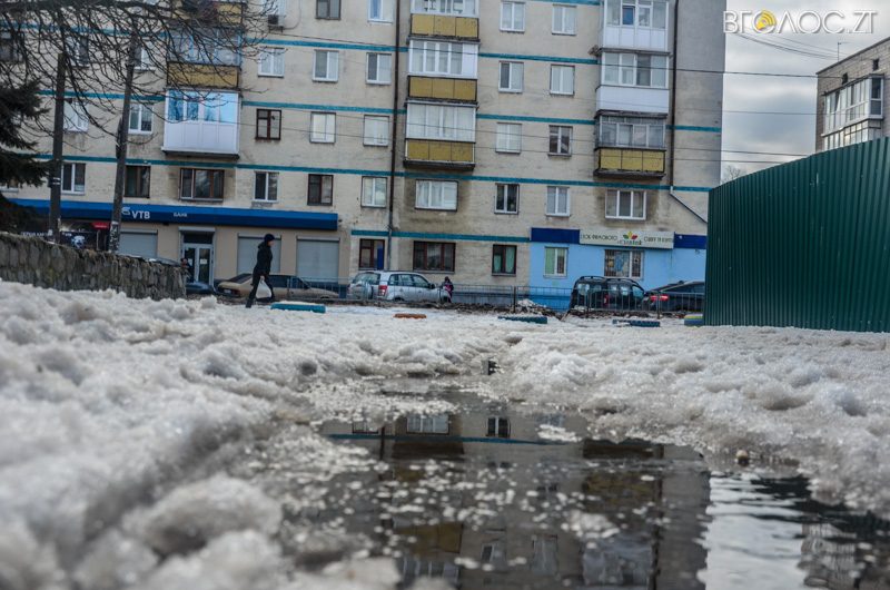 Ще тиждень тому, виходячи з будинків, житомиряни бачили у своїх дворах нечищений сніг. Нині ж він переворився на брудні калюжі. А з-під колись білого покрову, як гриби після дощу, “повиростали” пляшки, папір, пакети та інше сміття, яке городяни вдало приховували від людського ока під час чергового снігопаду.